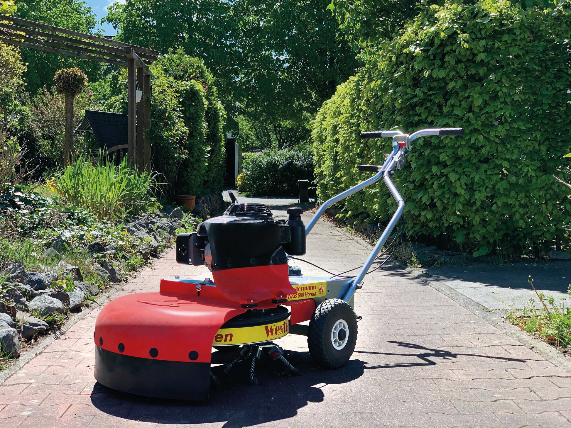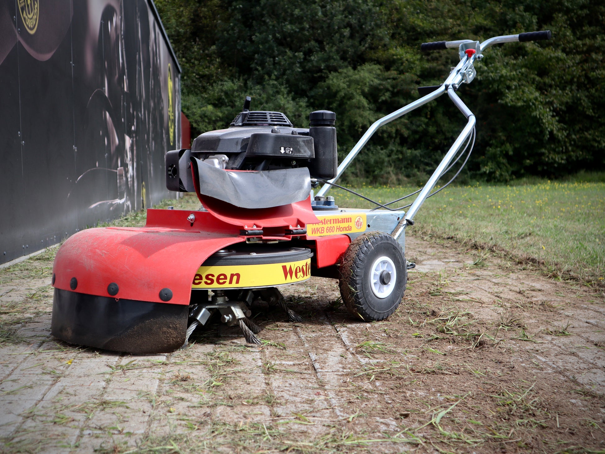 Introducing the WKB 660 Honda Weed Brush—the award-winning solution for professional weed control. Recognized with the silver medal at Demopark 2019 and the gold medal at the Lamma Show in the UK, this machine is proven to deliver outstanding results. Its built-in planetary gearbox drives three independently rotating brush carriers, ensuring even ground pressure that protects surfaces while attacking weeds from all sides, right down to the roots. With durable, adjustable wire tines and a height-adjustable wheel suspension, the WKB 660 Honda combines strength, precision, and reliability—making it the ultimate tool for powerful, surface-safe weed removal.